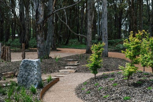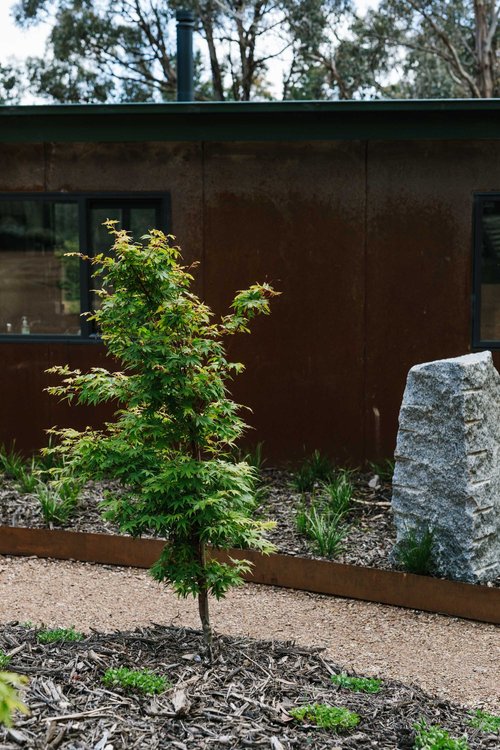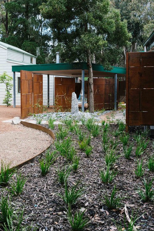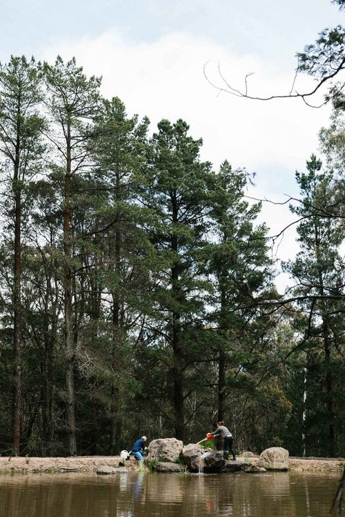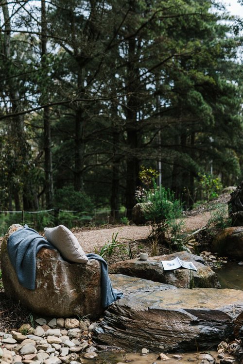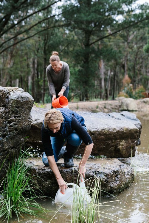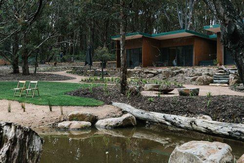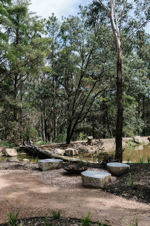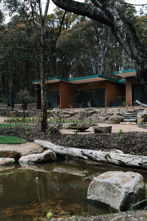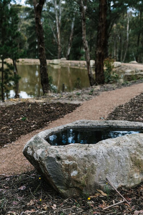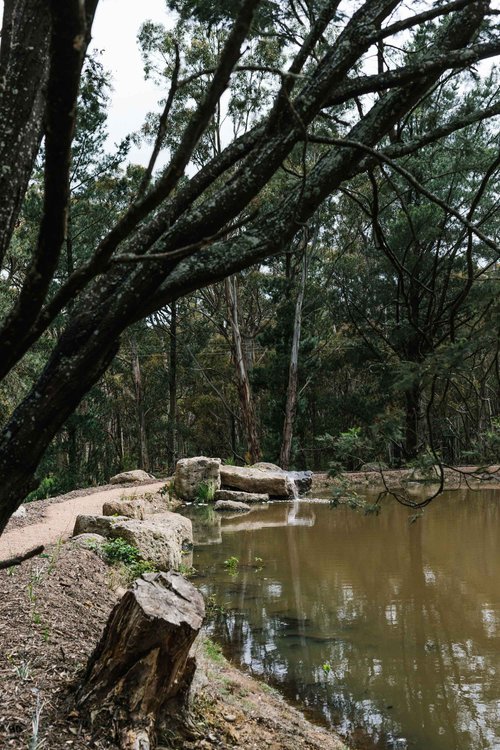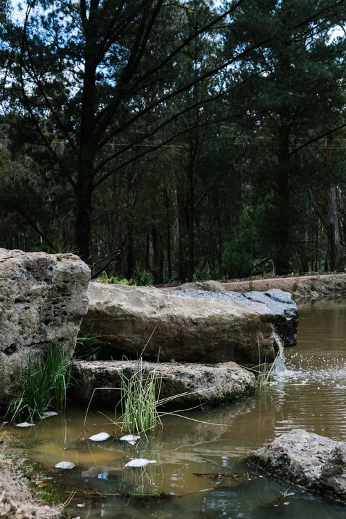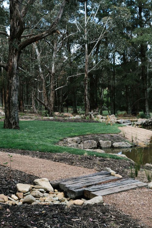 This property in Woodend saw the conversion of an existing dam into a billabong and wetland habitat for birds and frogs. Stormwater was re-directed into dry river beds, and large rock steppers and timber bridges enable the owners to fully engage and explore the garden. Design implemented late 2016.