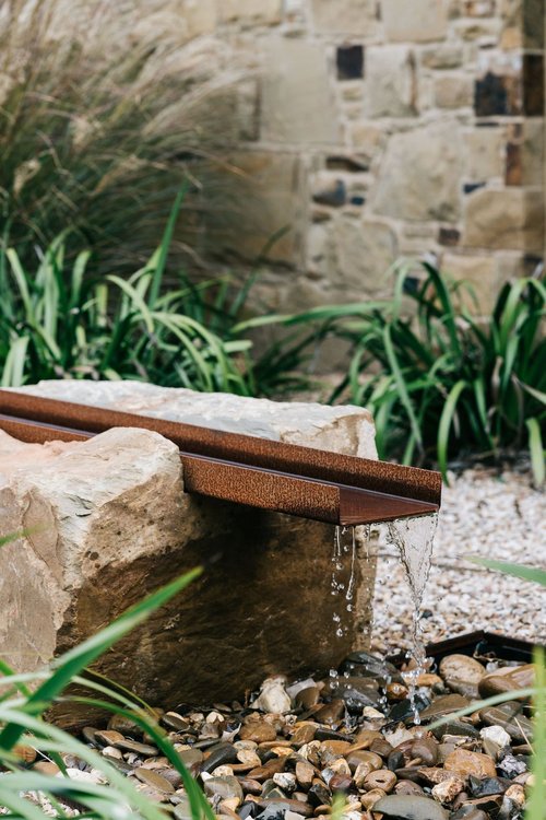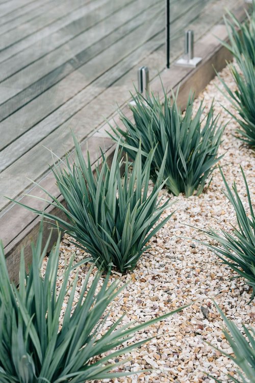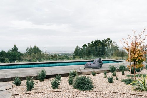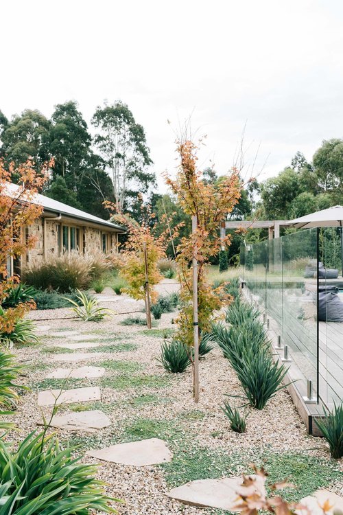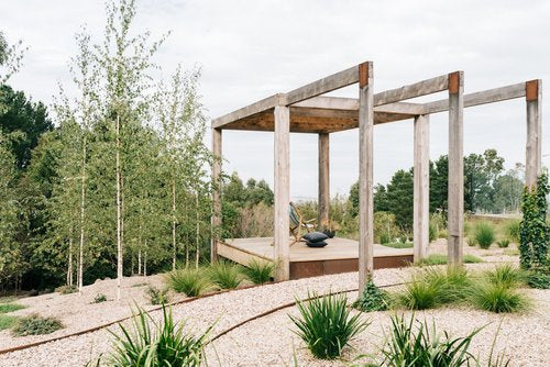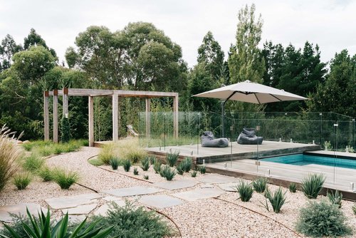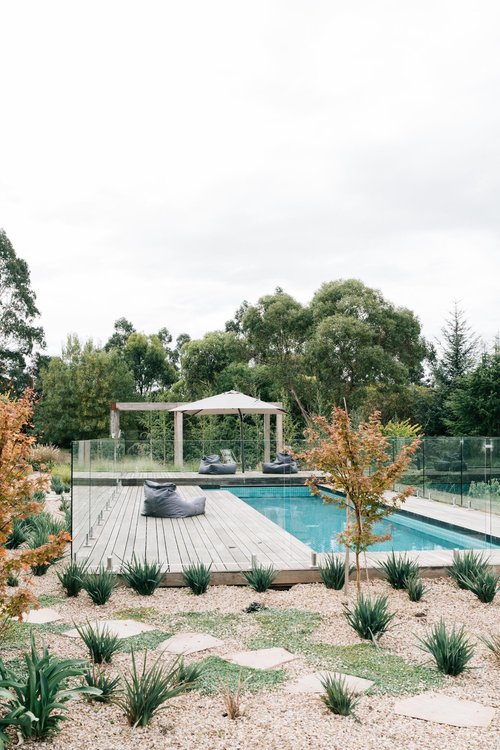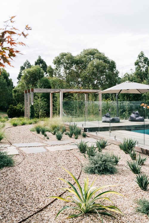 Perched high on Mount Gisborne with spectacular views, this garden was designed to take in the wider landscape whilst enjoying the pool. The garden has been mulched with stone to assist in managing weeds whilst being fire retardant. The use of natural materials links directly to the architecture of the home.